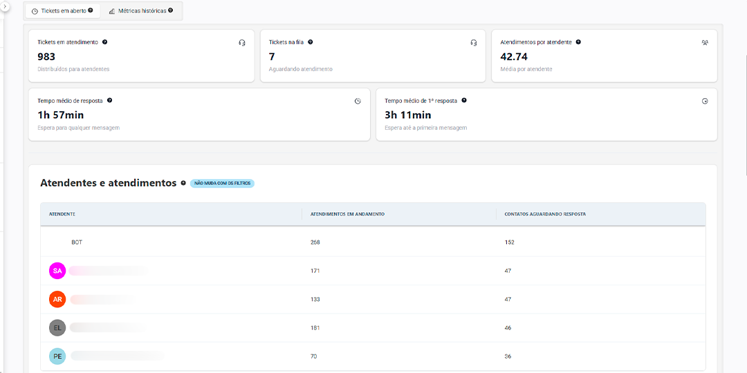 O Relatório de Métricas Humanas reúne, em um único painel, os principais indicadores do atendimento da clínica, mostrando o que está acontecendo em tempo real e o histórico da operação.